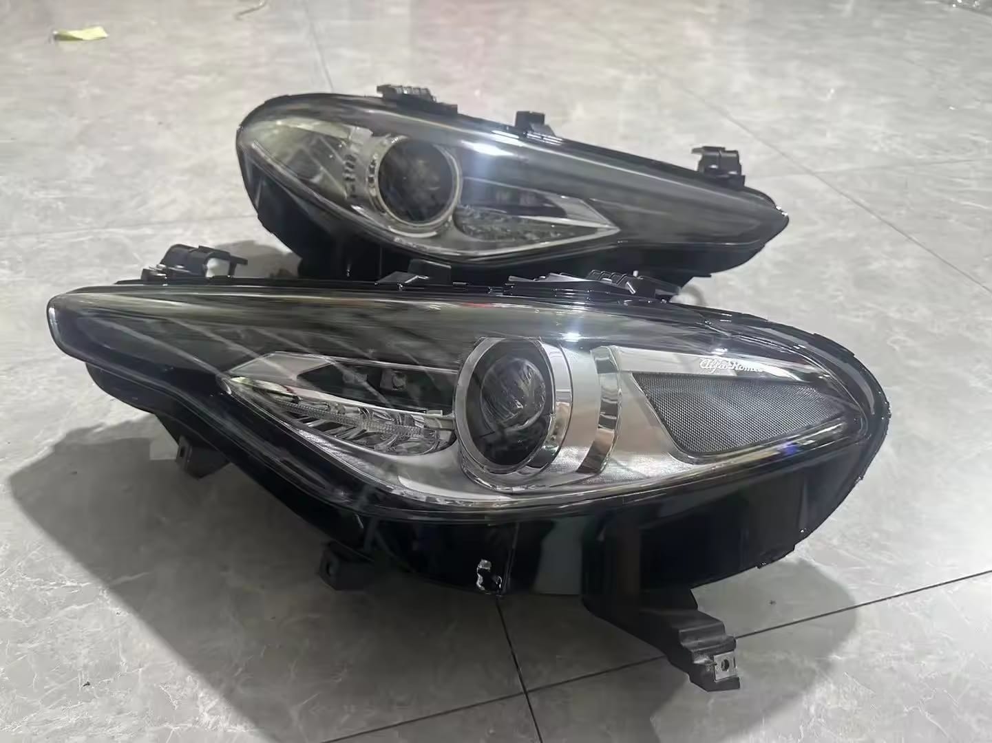 Alfa Romeo Giulia-ს წინა ფარები (ევროპული ვერსია). ფარები არ არის ამერიკული (US-spec) და არ აქვს ნარინჯისფერი გვერდითი რეფლექტორი. განკუთვნილია ევროპული სტანდარტის Giulia მოდელებისთვის და წარმოადგენს ორიგინალური დიზაინის წინა ოპტიკას.